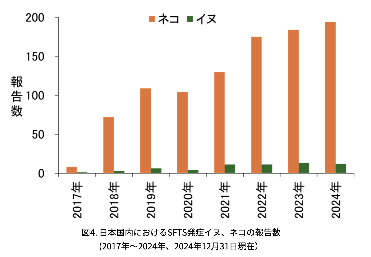 特に近年話題になっているのが重症熱性血小板減少症候群(SFTS)で、人間がマダニに咬まれることにより感染し、2025年7月現在、西日本を中心に累計126名の死者が報告されています。また、犬や猫へのSFTS感染も数多く報告されており、SFTSに感染した犬の致死率は30%、猫は60%に達します。近年では、感染した犬や猫から人への感染事例が多数報告されており、STTS感染猫から感染してしまった人の死亡事例も複数発生しており、ペットから人へのSFTS感染を防御する観点から犬猫のマダニ予防の必要性が声高に叫ばれています。家族を守るためにもペットにはマダニ予防薬を定期的に投薬しましょう。 |